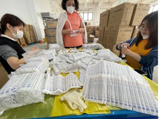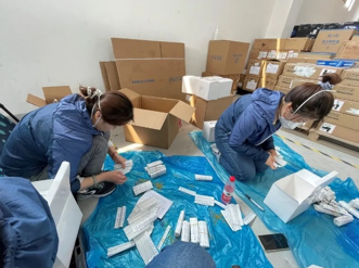 流水线协作贯穿了工作始末,我们要将原本20个一捆的棉签与25个一盒的试剂盒匹配,方便快速出货。