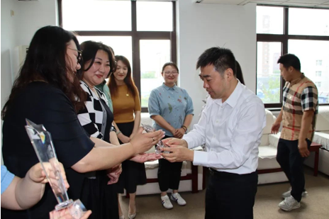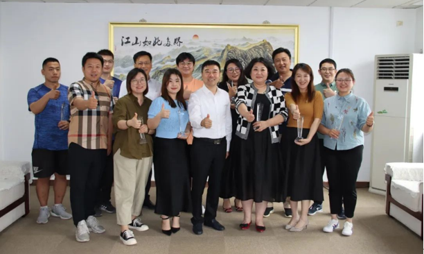 隔离结束后,“家人们”为我们精心举办了隆重的欢迎仪式,更让我们感到受宠若惊的是,赵勇书记带队亲临企业,与我们亲切座谈,颁发“援沪抗疫先锋”奖杯。